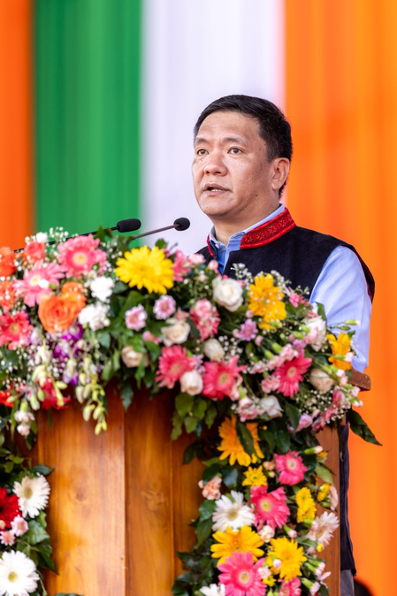 Hoisting the national flag on the occasion of the 79th Independence Day celebration at the Indira Gandhi Park in Itanagar, the Chief Minister said, “Let us support our farmers, artisans, and entrepreneurs. Every Swadeshi choice strengthens our economy and our people.”