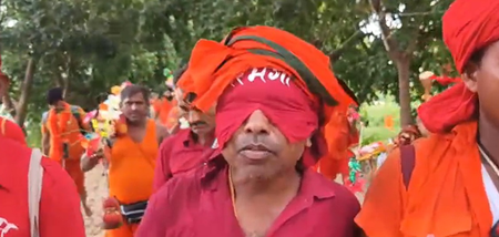 Munger, July 14 (IANS) In a remarkable display of devotion, the followers of Lord Shiva, popularly known as Baba Bholenath, undertook an extraordinary journey in Bihar’s Munger district. Blindfolded and guided by faith alone, the devotee walked the Kachhi Kanwaria Path to Baba Dham, vowing to complete the pilgrimage within 24 hours and offer water to the deity.