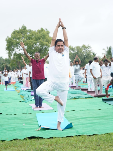 Union Minister of State for Jal Shakti and Railways V. Somanna took part in Yoga Day celebrations at the historical site of Halebidu in Hassan district.